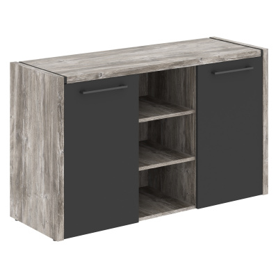 Изделие из 3-х секций: секция с полкой, секция открытая с полками, секция под холодильник. Топ и каркас тумбы в цвете Кария Пальмира или Сосна Нордик. Фасады, декоративные проставки в цвете Антрацит. Ручки черного цвета с межцентровым расстоянием 256мм. Внутренний размер под холодильник 450х450х771мм.
