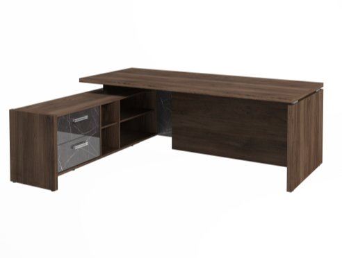 Столешница, бок стола и бок тумбы выполнены из ЛДСП толщиной 38 мм. Цвет - "Орех Пацифик Табак". Кромка 2 мм.