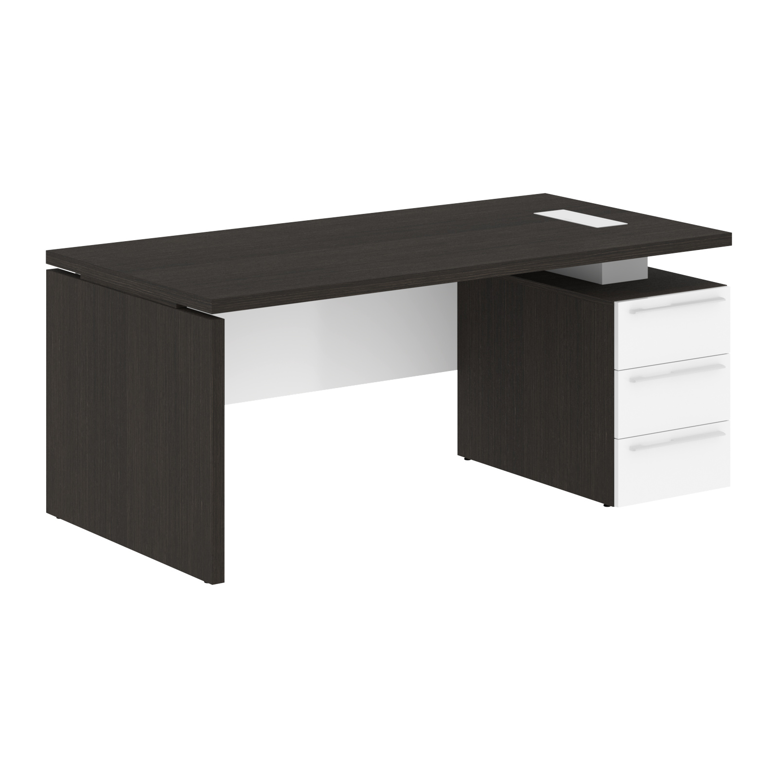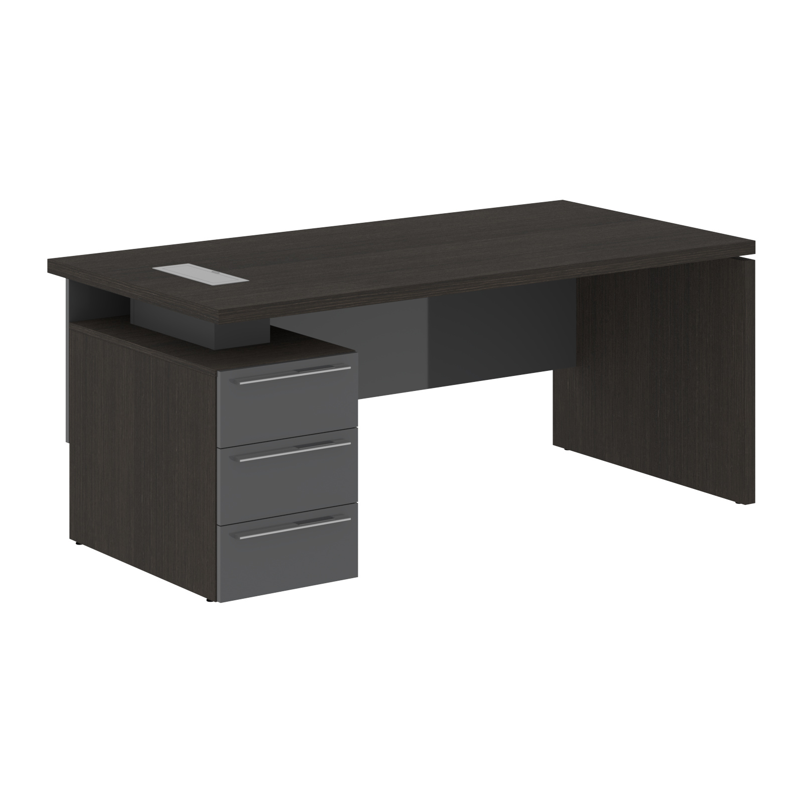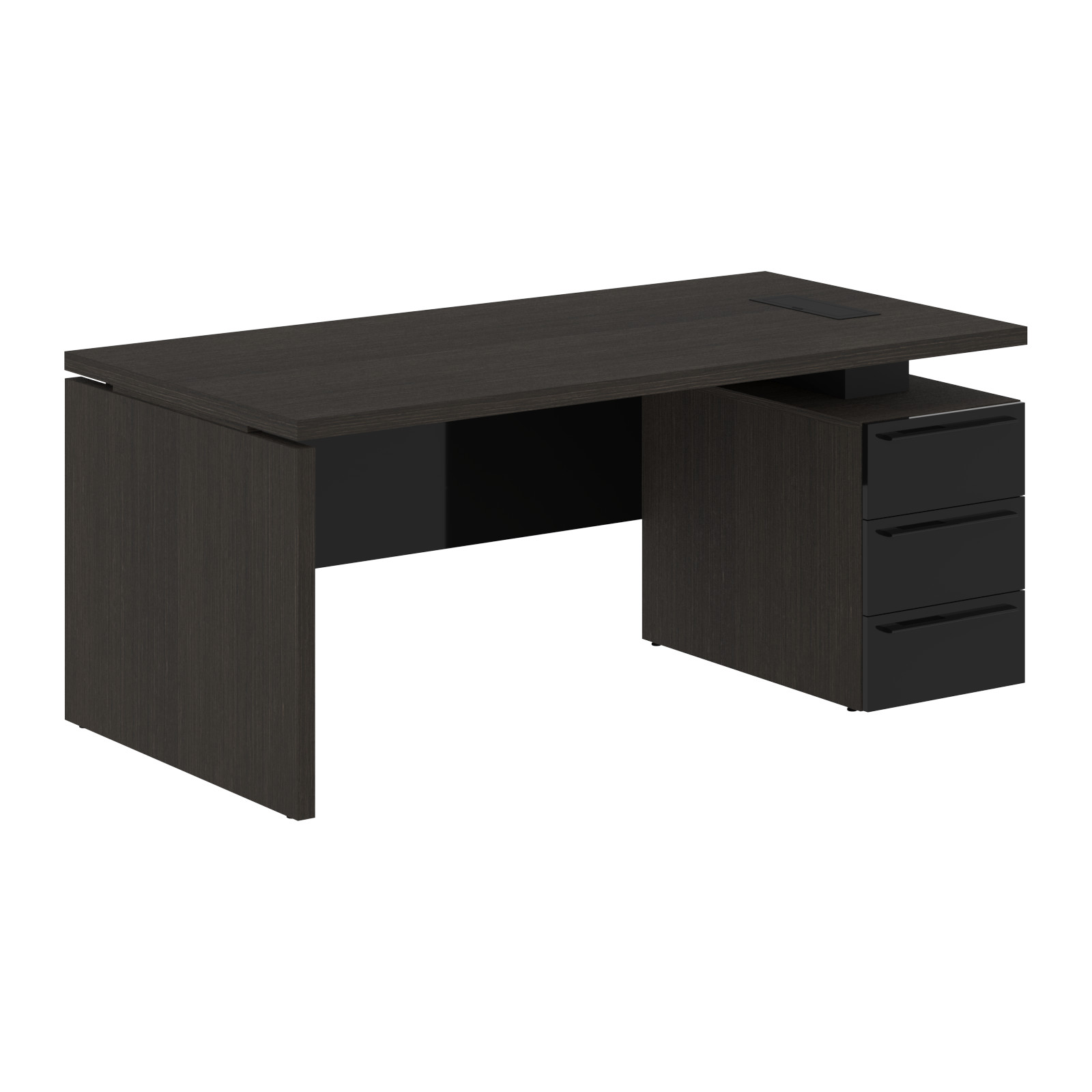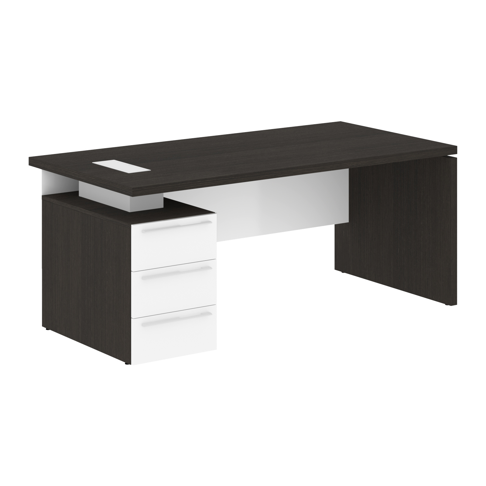 Столешница, опора из МДФ т.39мм, облицованы шпоном с защитно-декоративным покрытием. Царга из МДФ т.18мм с защитно-декоративным покрытием "высокий глянец", высота 350 мм. Каркас тумбы из МДФ т.18 мм, облицован шпоном с защитно-декоративным покрытием. Ящики из ЛДСП т.18мм, торцевые поверхности защищены кромкой ПВХ т.1 в цвет. Направляющие ящиков - шариковые 450мм с доводчиками. Фасады из МДФ т.18мм с защитно-декоративным покрытием "высокий глянец". Ручки металлические ORION 320/340. Проставки в столе из МДФ т.16 мм с защитно-декоративным покрытием "матовый". Заглушка кабель-канала и ручка в цвет проставок стола. Опоры регулируемые.