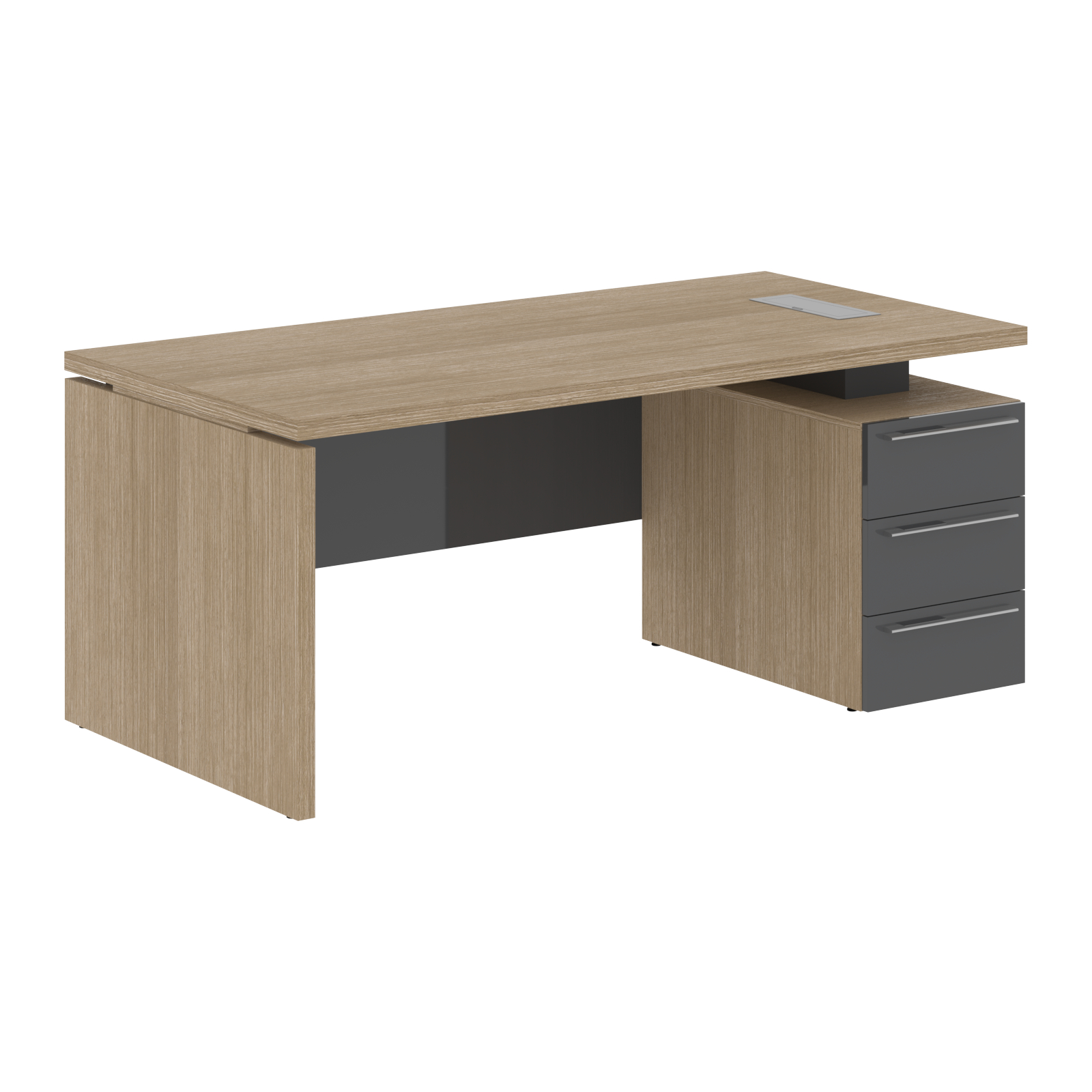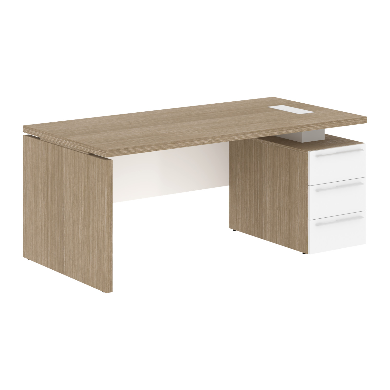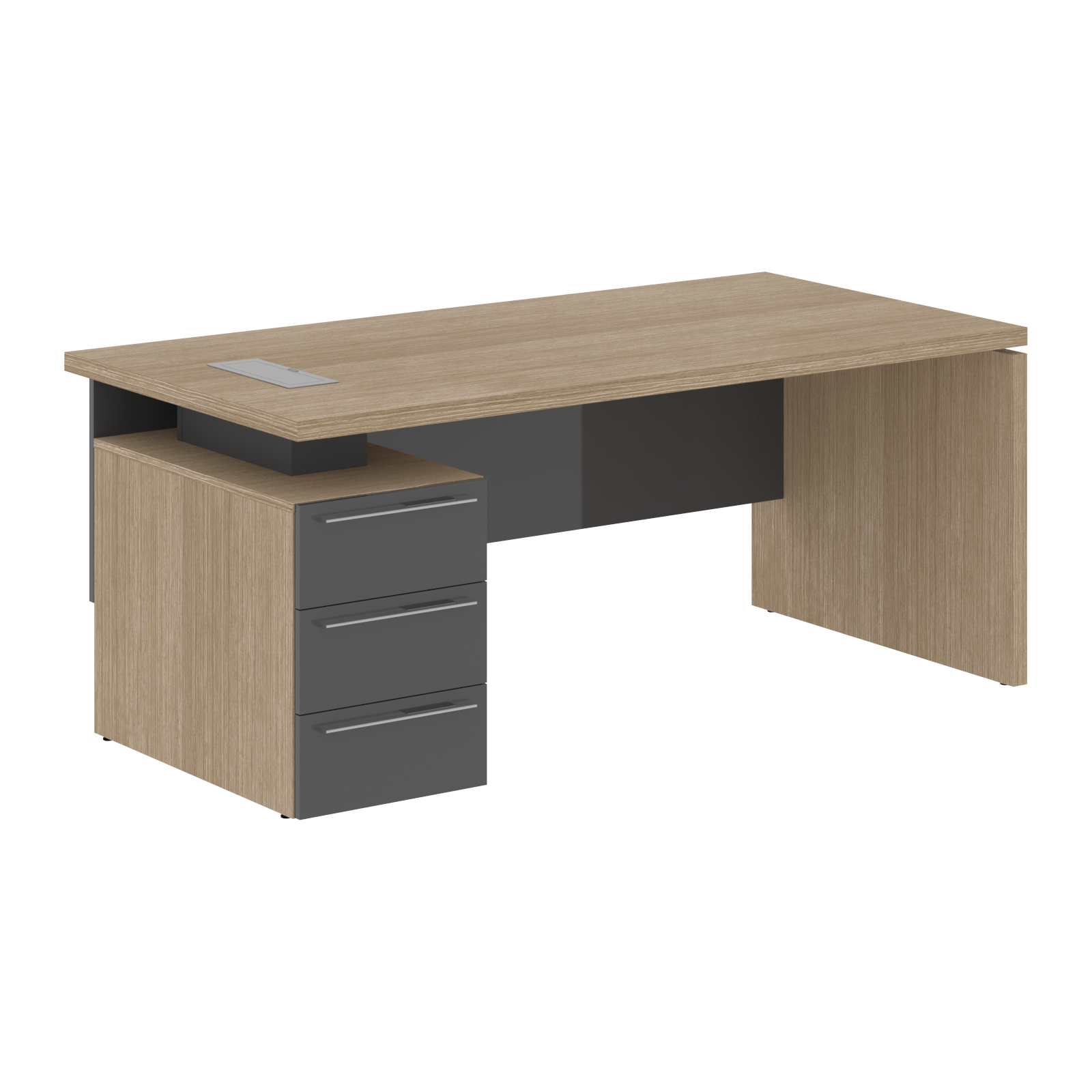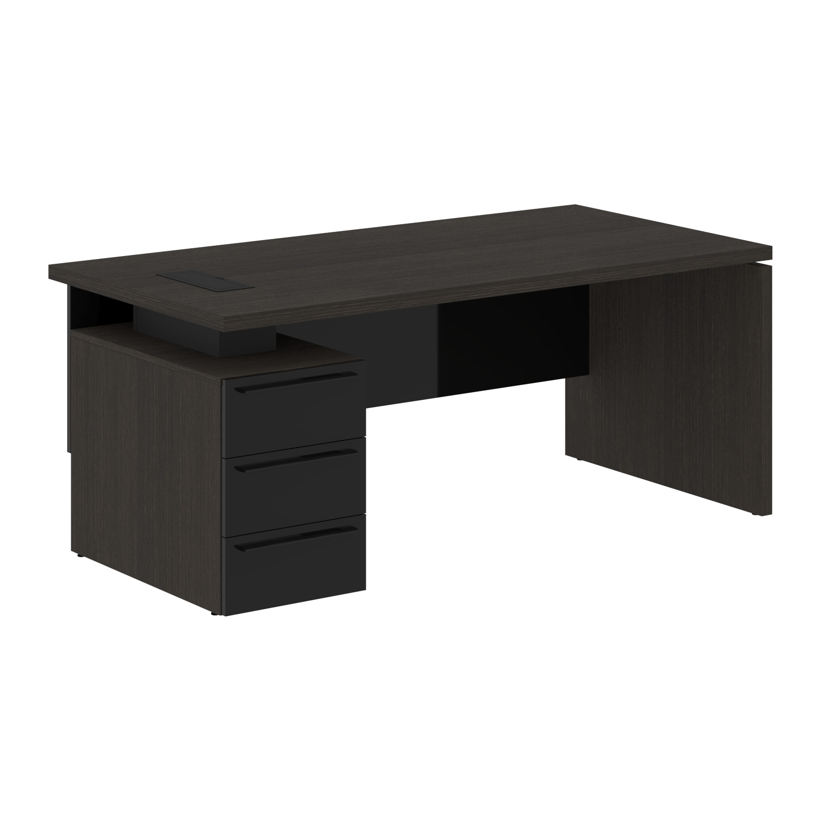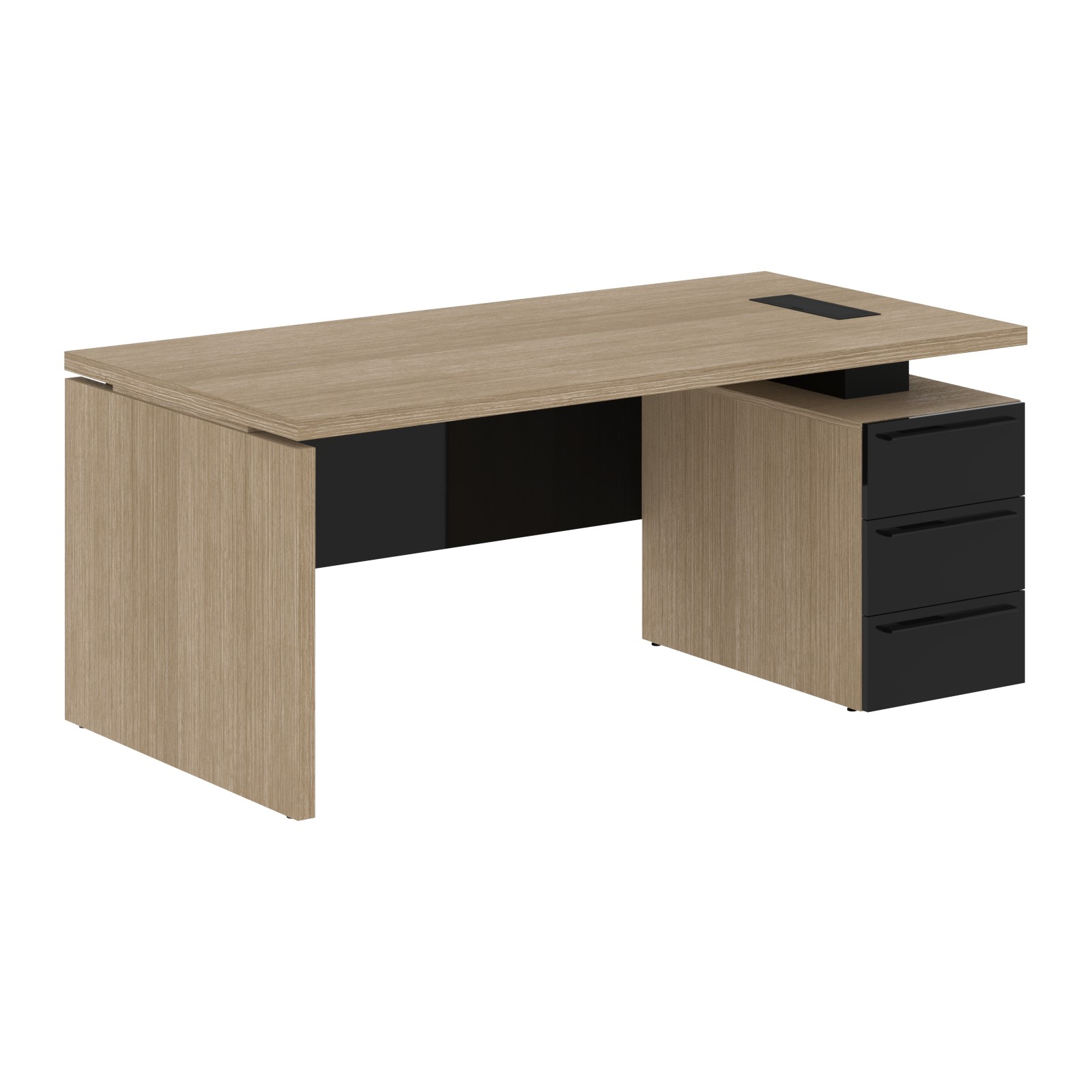Столешница, опора из МДФ т.39мм, облицованы шпоном с защитно-декоративным покрытием. Царга из МДФ т.18мм с защитно-декоративным покрытием "высокий глянец", высота 350 мм. Каркас тумбы из МДФ т.18 мм, облицован шпоном с защитно-декоративным покрытием. Ящики из ЛДСП т.18мм, торцевые поверхности защищены кромкой ПВХ т.1 в цвет. Направляющие ящиков - шариковые 450мм с доводчиками. Фасады из МДФ т.18мм с защитно-декоративным покрытием "высокий глянец". Ручки металлические ORION 320/340. Проставки в столе из МДФ т.16 мм с защитно-декоративным покрытием "матовый". Заглушка кабель-канала и ручка в цвет проставок стола. Опоры регулируемые.
