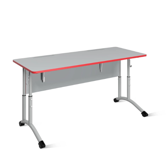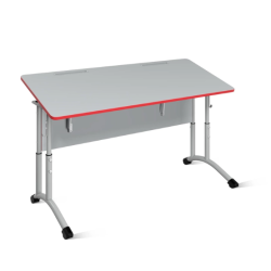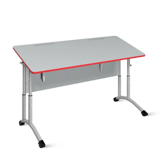 Стол изготовлен на металлокаркасе из тонкостенных стальных труб с применением ЛДСП класса эмиссии Е1 толщиной 16мм. Столешница из ЛДСП облицована ударопрочной кромкой ПВХ 2мм. Края крышки закруглены радиусом 28мм. Элементы стола из ЛДСП облицованы кромкой ПВХ 0,4-2мм. Царга крепится евровинтами 7х70мм. Крышка крепится винтами М6 через карточные петли с фиксатором наклона, что позволяет устанавливать её под углом 0-19˚ с фиксацией в промежуточных положениях с шагом 2-3˚. Каркас изготовлен из стальной трубы круглого профиля Ø32х1,5; Ø32х1,2; Ø25х1,2 и плоскоовального профиля 30х15х1,2 мм, с возможностю регулировкой высоты в трёх положениях, фиксируемых шестью винтами М8. Металлокаркас окрашен защитной полимерно-порошковой эмалью. Концы труб закрыты пластиковыми заглушками, в основании каркаса установлены пластиковые опоры. С боков стола имеются металлические крючки. Стол снабжен лотком для канц.принадлежностей. Изготавливается в двух ростовых группах и трёх диапазонах регулирования (3-5; 5-7) по ГОСТ 11015-93.