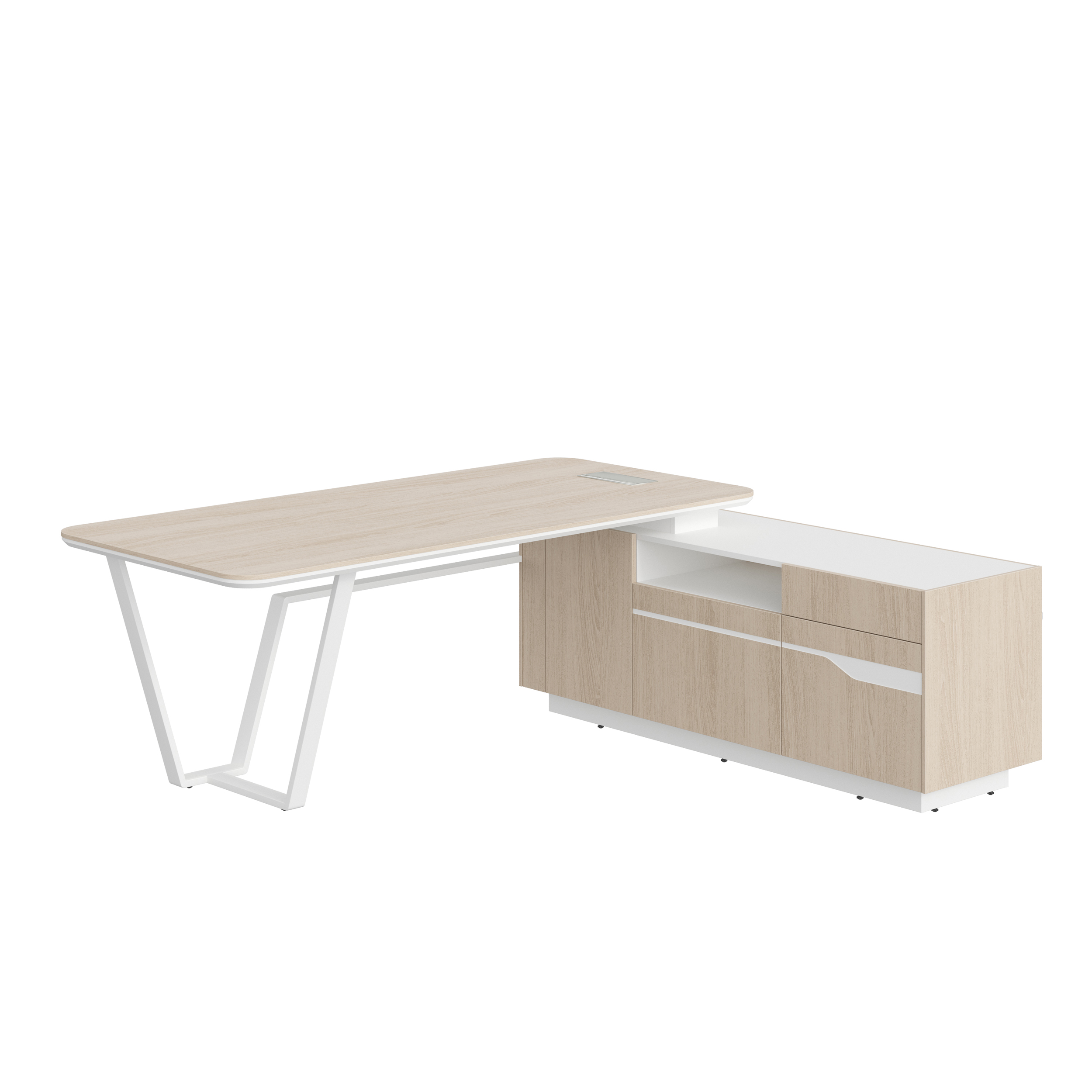 Столешница комбинированная, общая толщина - 37 мм. Верхняя часть из МДФ т.12мм, покрытие - шпон. Нижняя часть из окрашенного МДФ т.25мм, имеет фрезерованный скос по внешнему краю. Каркас тумбы из ЛДСП т.18мм, кромка ABS т.0.8мм. Декоративные боковые стенки и задняя стенка тумбы - из МДФ т.12мм, покрытие - шпон. Фасады тумб - фрезерованное МДФ т.19мм, покрытие - шпон, декоративные вставки - покрытие цветной эмалью. Ящики из ЛДСП, скрытые шариковые направляющие полного выдвижения с системой открывания "push to open". Опоры из металла 20х60 мм, толщина металла 1,5 мм, покрытие порошковой краской. Столешницы оснащены встраиваемым блоком розеток, корпус блока - алюминий, дополнен крышкой и защитными щеточками. Внутри блока - сетевые розетки, USB и сетевые порты.