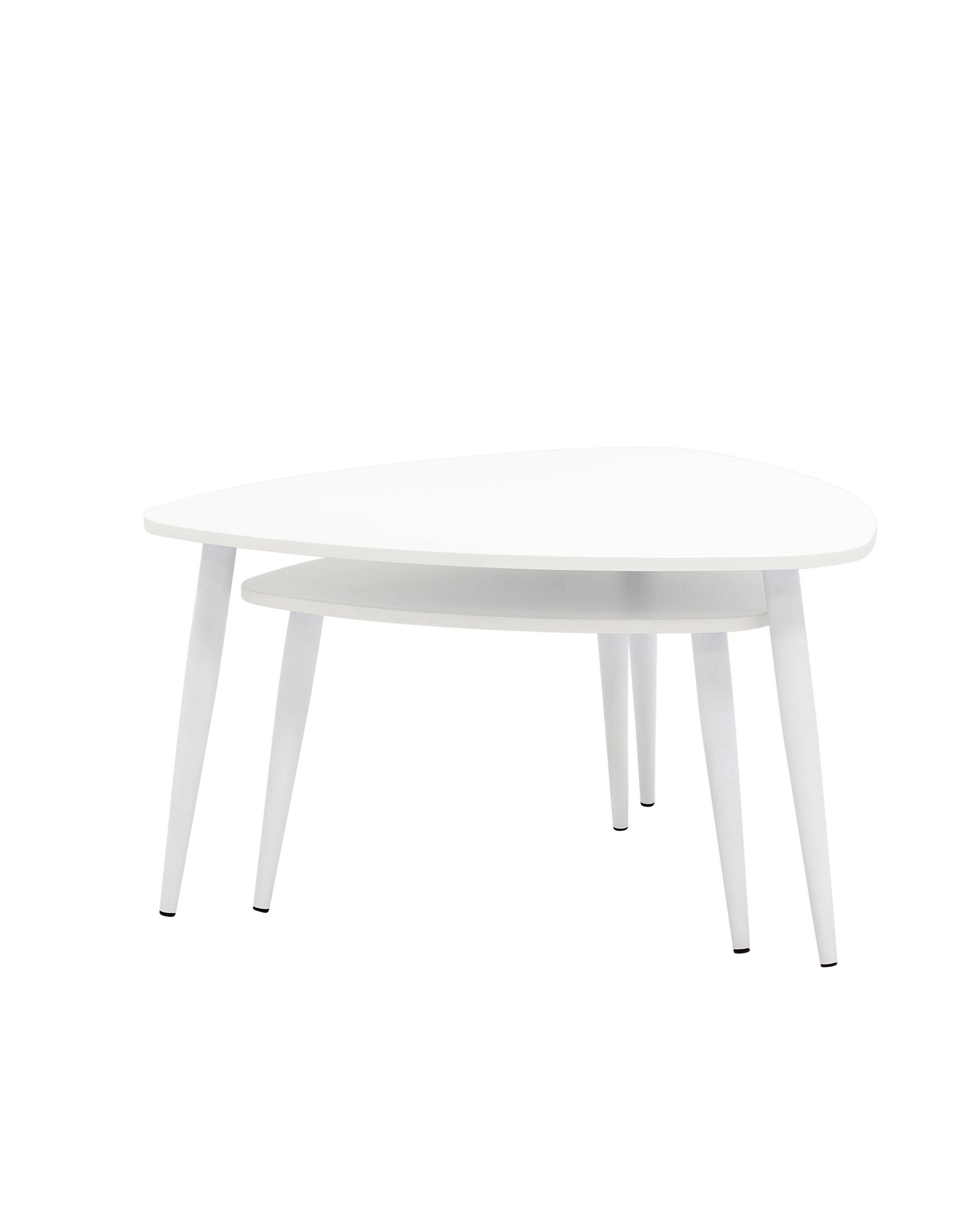 Два журнальных столика с белой треугольной столешницей разного размера в наборе. Столешница изготовлена из МДФ, ножки металлические. Белый цвет столика не перетягивает внимание и хорошо сочетается с разными фактурами и материалами мебели.