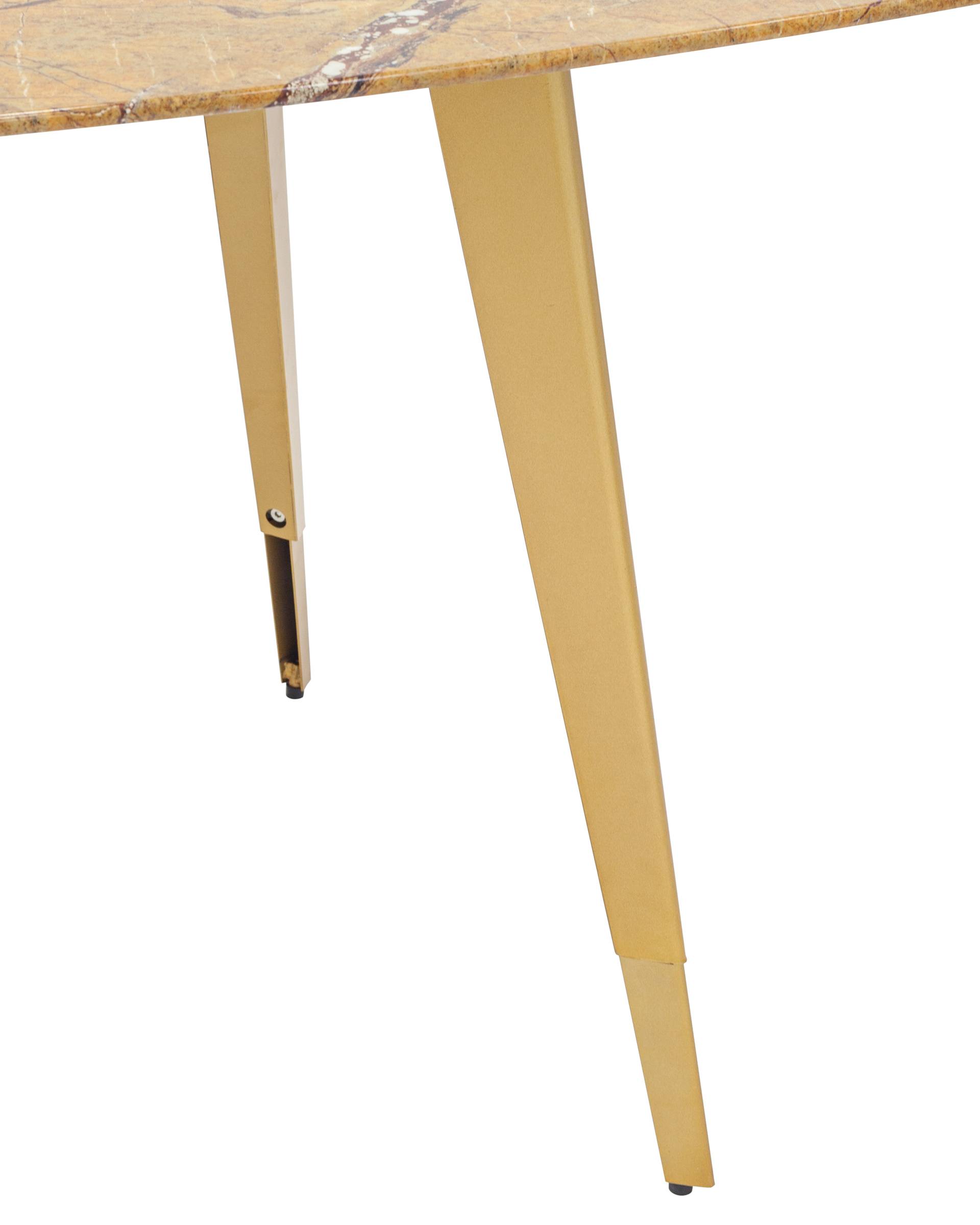 Обеденный стол с красивой стеклянной столешницей насыщенного цвета охры с рисунком под мрамор.