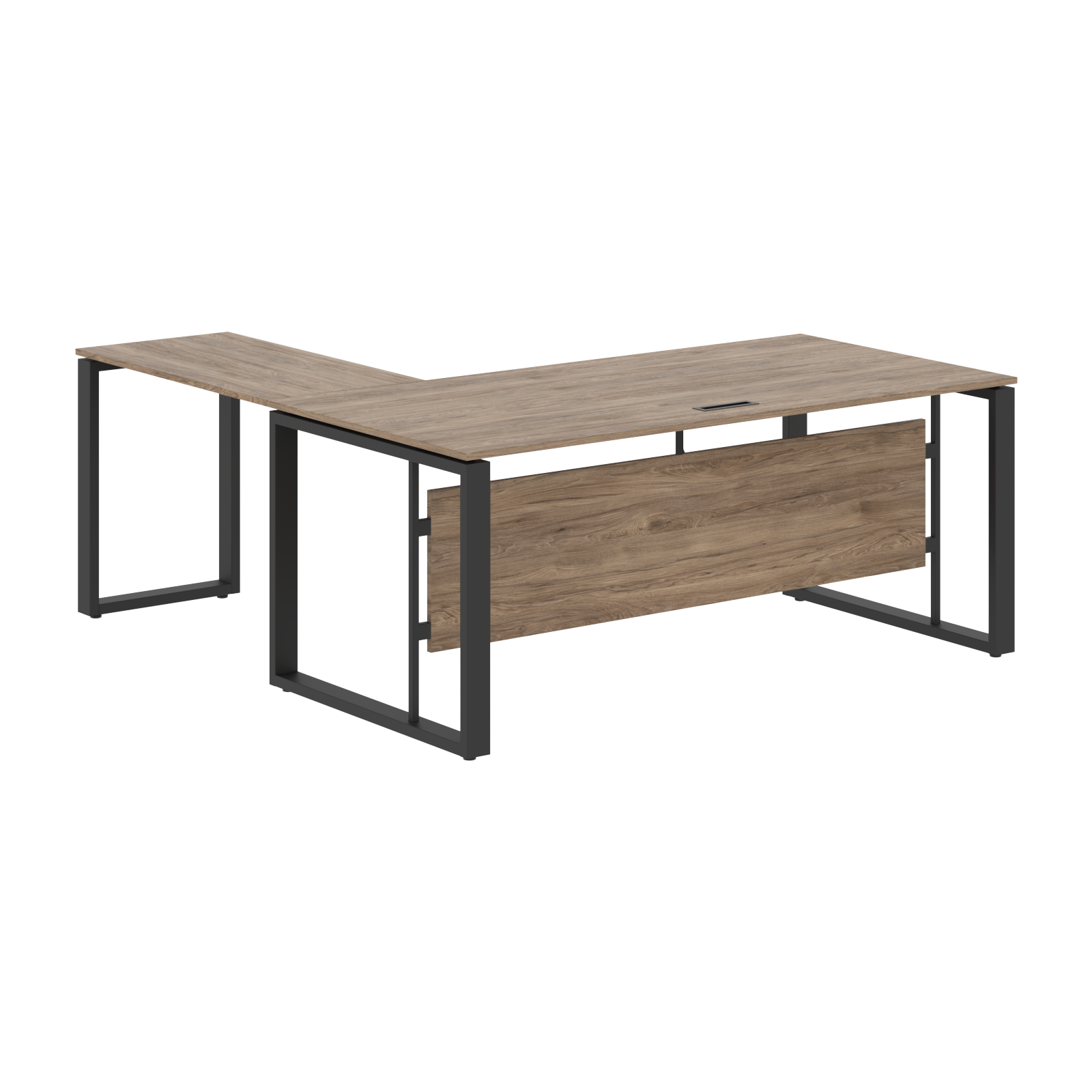 Столешницы стола и приставки из ЛДСП т.18мм с кромкой ПВХ по периметру т.2мм. Столешница стола комплектуется заглушкой к/к черного цвета 180х51мм. Металлокаркас - опоры О-образной формы из профиля трубы 70х30х1,5, цвет - Антрацит, с регулировкой по высоте.