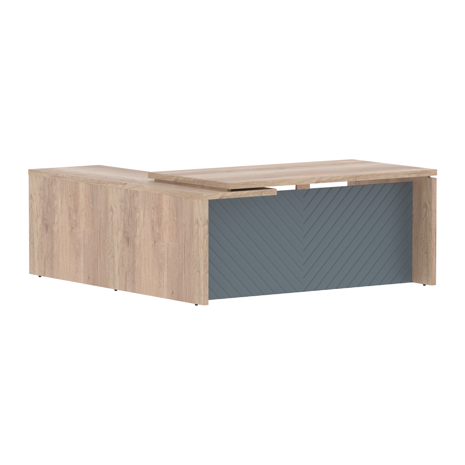 Столешница и опоры из ЛДСП толщиной 38мм с кромкой ПВХ т.2мм в цвет ЛДСП, расположение левое, правое. Стол комплектуется регулируемыми опорами. Фронтальная панель из одностороннего МДФ т.19мм фрезерованного крашенного матовой эмалью, высотой до пола h=640мм.