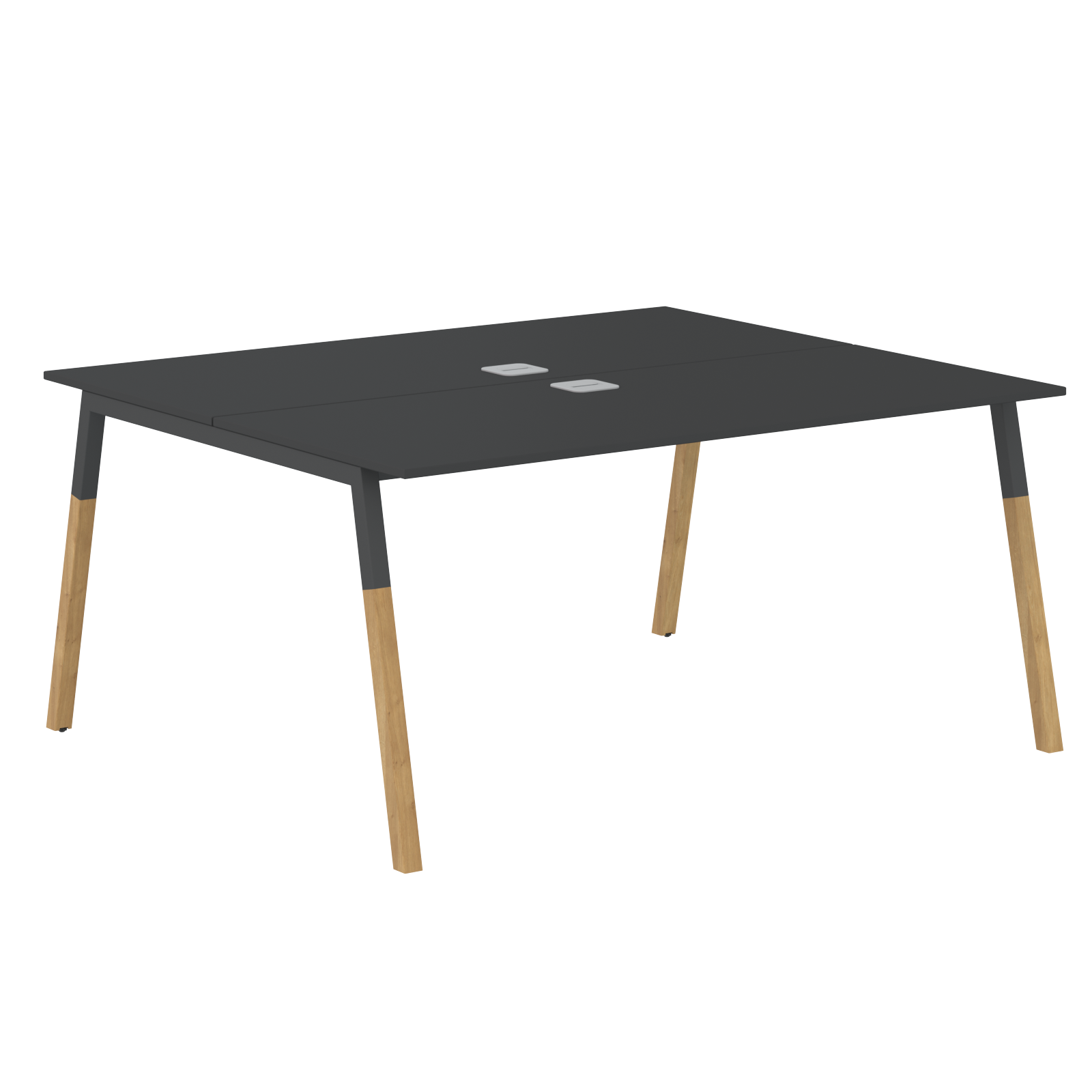 Столешницы из ЛДСП т.18мм. c кромкой ABS т.2.мм, каждая комплектуется квадратной заглушкой кабель-канала по центру и каждая 2-мя траверсами. Между столешницами имеется зазор 6 мм для установки настольных экранов. Опоры комбинированные А-образной формы, верхняя часть из профиля трубы 40х40мм и нижняя часть из массива бука; отделка – масло-воск. Опоры имеют регулировку внизу.
