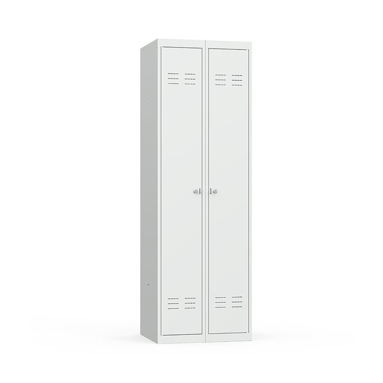 Шкаф имеет две секции, каждая из которых оснащается полкой для головных уборов, металлической перекладиной для вешалок и двумя пластиковыми крючками для одежды, проушиной для навесных замков. Размер секций обеспечивает комфортное размещение верхней одежды, в том числе зимней. Конструкция предусматривает возможность установки дополнительной полки для обуви.
