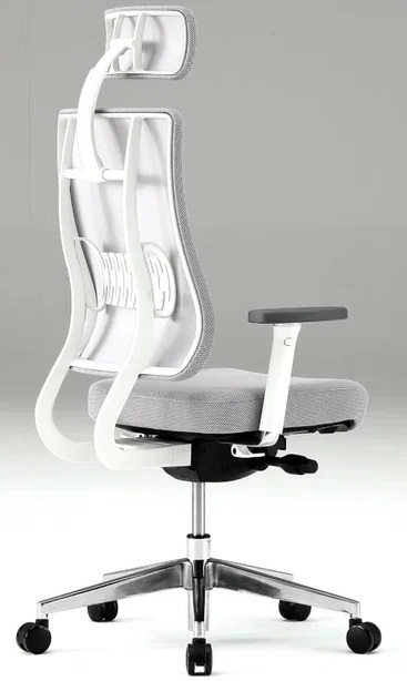 - Стандартное исполнение белый каркас, спинка серый сетка, сидение серый ткань.