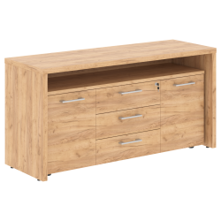 Состоит из консоли и тумбы с фригобаром под холодильник. Внутренний размер секции под холодильник 430х450х546мм. Ящики-фолдинги размером 400х539х400, роликовые направляющие.