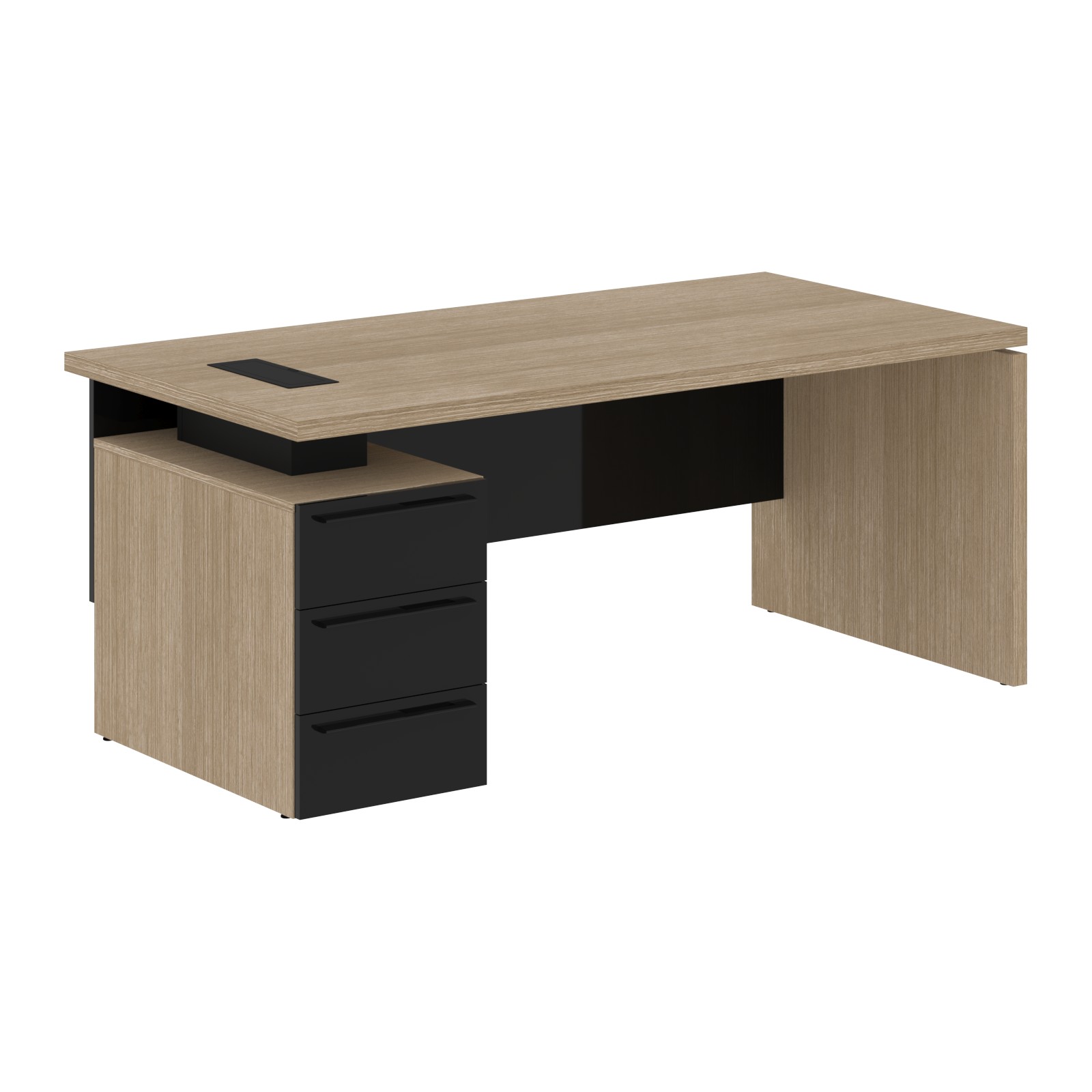 Столешница, опора из МДФ т.39мм, облицованы шпоном с защитно-декоративным покрытием. Царга из МДФ т.18мм с защитно-декоративным покрытием "высокий глянец", высота 350 мм. Каркас тумбы из МДФ т.18 мм, облицован шпоном с защитно-декоративным покрытием. Ящики из ЛДСП т.18мм, торцевые поверхности защищены кромкой ПВХ т.1 в цвет. Направляющие ящиков - шариковые 450мм с доводчиками. Фасады из МДФ т.18мм с защитно-декоративным покрытием "высокий глянец". Ручки металлические ORION 320/340. Проставки в столе из МДФ т.16 мм с защитно-декоративным покрытием "матовый". Заглушка кабель-канала и ручка в цвет проставок стола. Опоры регулируемые.